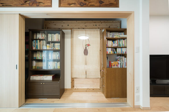 インナーガレージで荷物の出し入れも便利に。リビングで本やピアノを楽しむ時間が増え、暮らしにゆとりができました。季節ごとに暖簾を変えたり、思い出の絵を飾ったりして、今の住まいを大切に楽しんでいます。