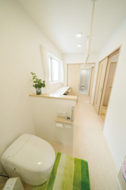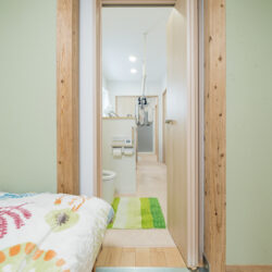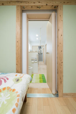 寝室からすぐに出入りできる水まわりからリビングまでが一続きのため、家事の負担を軽減。