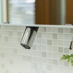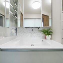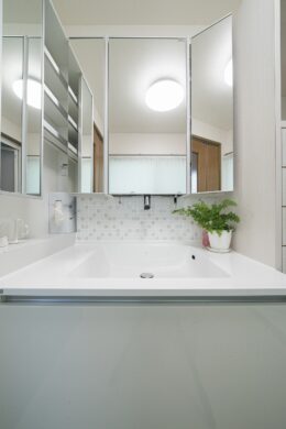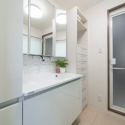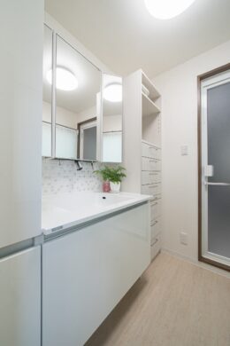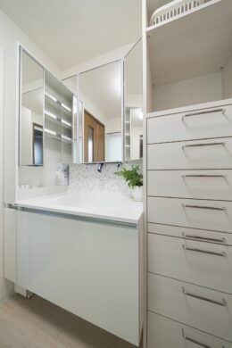 洗面台は既存の建具に合うシンプルな白を選びつつ、掃除のしやすさにも配慮した仕様に。