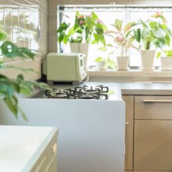 キッチンはLDKの中で最も目に入りやすく空間の印象を決める存在のため、主張しすぎず周囲と調和しながらも上質で高級感のあるものをご提案しました。面材や光の入り方、窓際のグリーンとの相性も考慮し、貼り方に遊び心を加えたタイルでさりげないアクセントを演出。