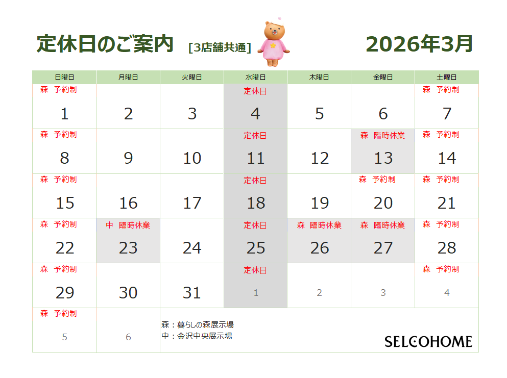 3月の定休日のお知らせ